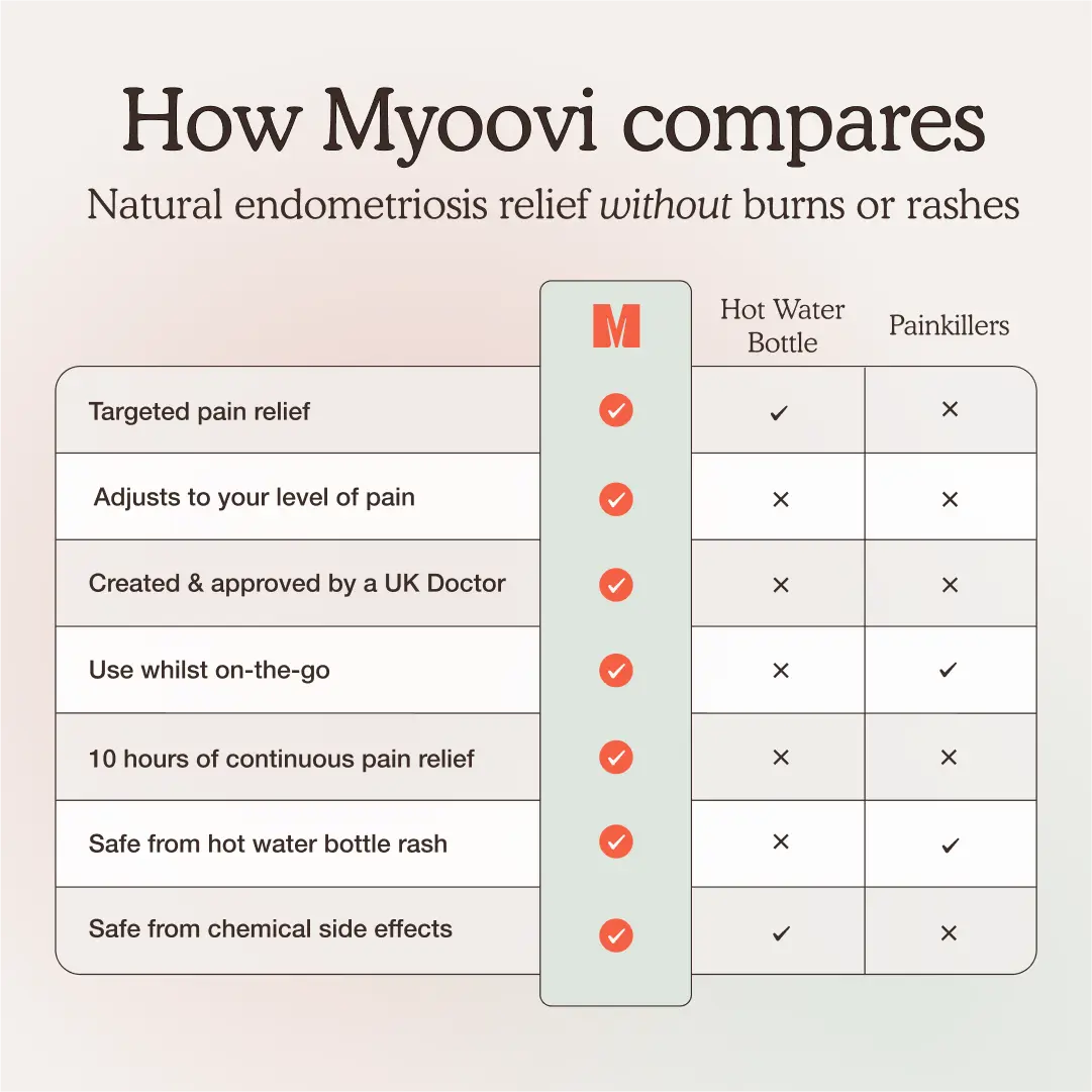 See how the Myoovi device compares against other endometriosis pain relief alternatives